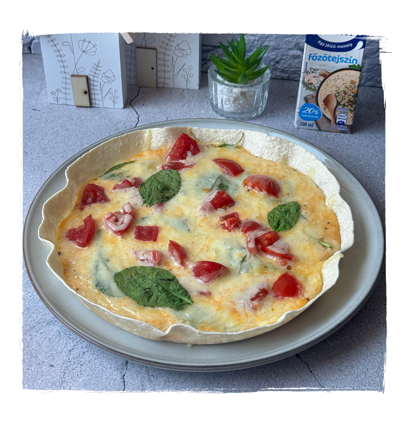 Egy hőálló edényt kibéleltem, egy tortillával, ráütöttem a tojást, sóztam, borsoztam, hozzáadtam 1 ek tejszínt és összekevertem. Hozzáadtam a spenótot és a feldarabolt paradicsomot, majd megszórtam sajttal.